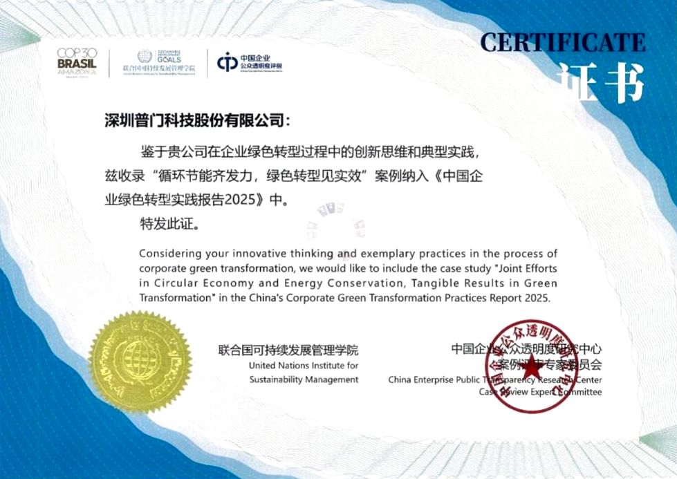 2025年11月15日,由生态环境部应对气候变化司指导,中国环境科学研究院、生态环境部环境发展中心、中国工业经济联合会、中国产业发展促进会联合主办的“低碳技术创新与产业实践”主题“中国角”边会顺利召开,同时发布了《中国企业绿色转型实践报告2025》(以下简称《报告》)。普门科技“循环节能齐发力,绿色转型见实效”案例入选该《报告》。