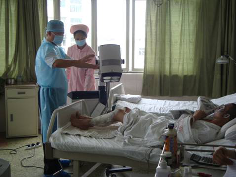 6月8日,五名由国家卫生部从全国调集的专家抵达成都军区总医院,并迅速投入到事故伤员的救治工作中。“成都军区总医院的大量伤员救治需要光子治疗仪!” 在8日的协调会上,众多专家向“6.5”公交车燃烧事故应急指挥部提出建议。 作为专业制造光子治疗仪的设备生产厂商—深圳普门科技有限公司,在接到总医院的紧急通知后,公司高层于当天夜里的12点亲自到深圳机场将三台最顶尖配置的Carnation 66光子治疗仪送上飞往成都的飞机。 9日凌晨,仪器抵达成都。一直等候在医院的普门公司工程师立即将机器安装好送到救治现场,并投入使用。