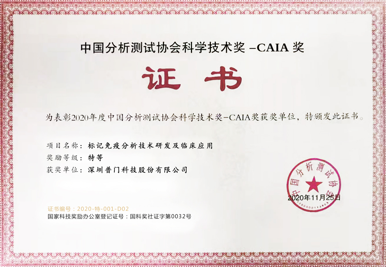2020年12月10日,2020年中国分析测试协会科学技术奖(CAIA 奖)颁奖典礼在北京举行,普门科技喜获中国分析测试协会科学技术奖【特等奖】!